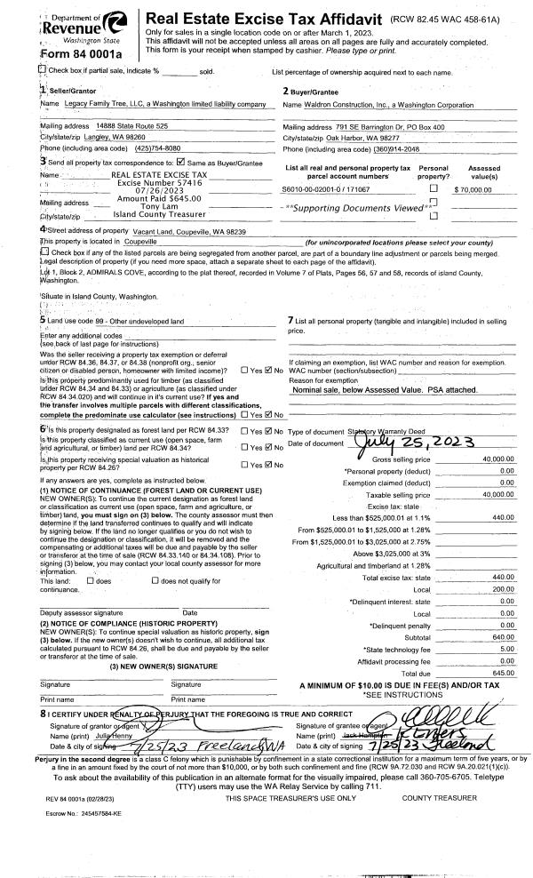 | 2 | 07/25/2023 | WD | Warranty Deed | LEGACY FAMILY TREE LLC | WALDRON CONSTRUCTION, INC. | | | $40,000.00 | 57416 | 4562672 |
