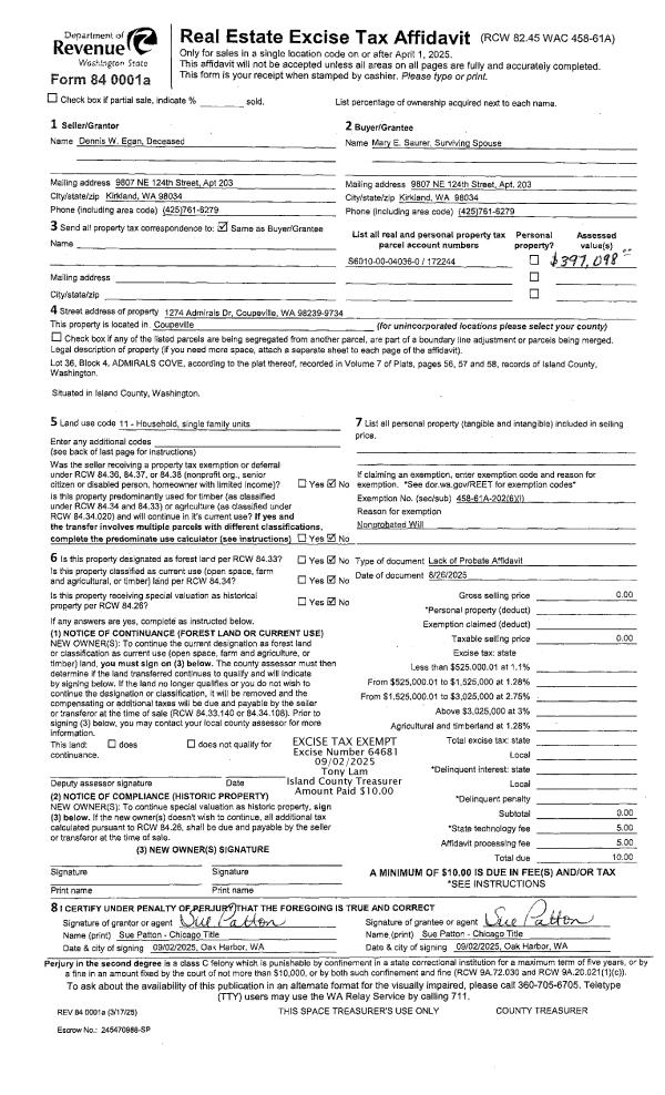 | 2 | 08/26/2025 | LACPROBATE | Lack of Probate | EGAN, DENNIS W | SAURER, MARY E | | | $0.00 | 64681 | 4590362 |