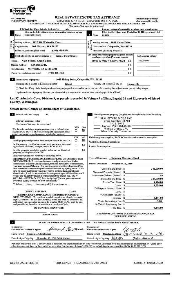 | Mailing Address: | CHRISTINA D OLIVER 1089 HALSEY DR COUPEVILLE, WA 98239 | % Ownership: | 100.0000000000% |