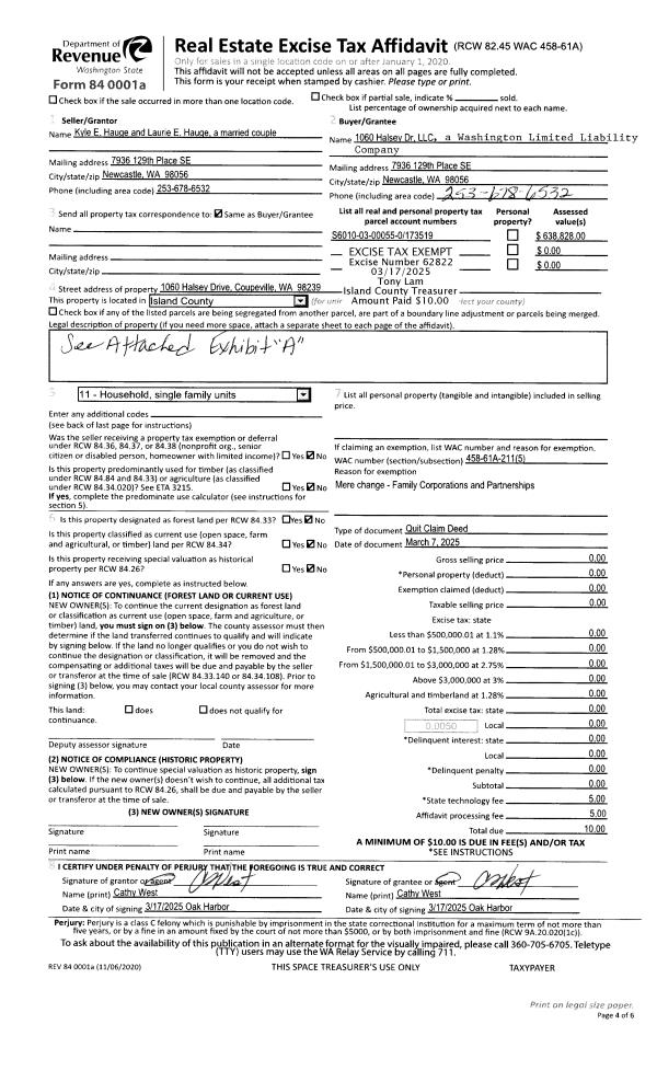 | 1 | 03/07/2025 | QCD | Quit Claim Deed | HAUGE, KYLE E | 1060 HALSEY DR, LLC | | | $0.00 | 62822 | 4583294 |