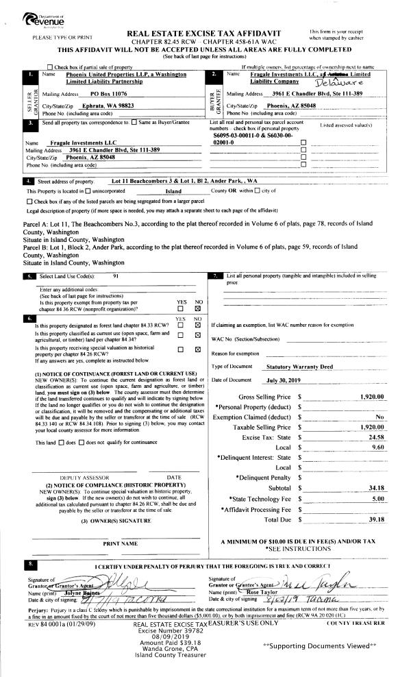 | 2 | 07/30/2019 | WD | Warranty Deed | PHOENIX UNITED PROPERTIES LLP | FRAGALE INVESTMENTS, LLC | | | $1,920.00 | 39782 | 4468997 |