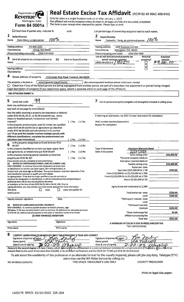 | 1 | 02/22/2023 | WD | Warranty Deed | MOSS, KEVIN | PEREZ, CONSUELO L | | | $20,000.00 | 55933 | 4557063 |