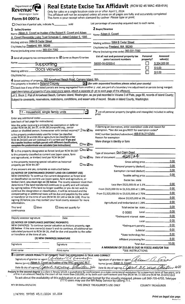 | 1 | 04/25/2024 | QCD | Quit Claim Deed | COVERT TTEE, AILEEN A | COVERT, AILEEN A | | | $0.00 | 59785 | 4571798 |