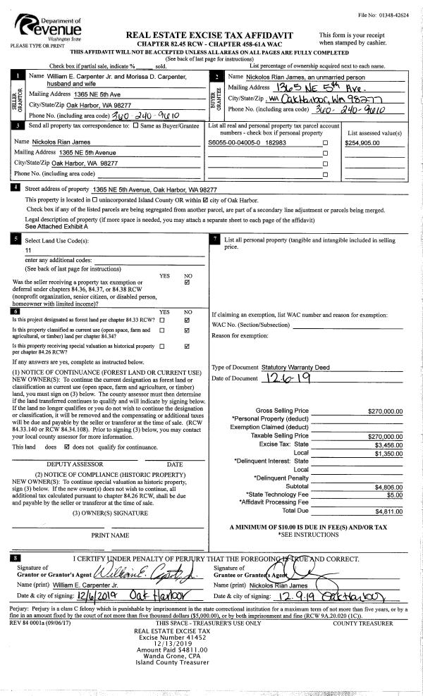 | 2 | 12/06/2019 | WD | Warranty Deed | CARPENTER JR, WILLIAM E | JAMES, NICKOLOS RIAN | | | $270,000.00 | 41452 | 4477450 |