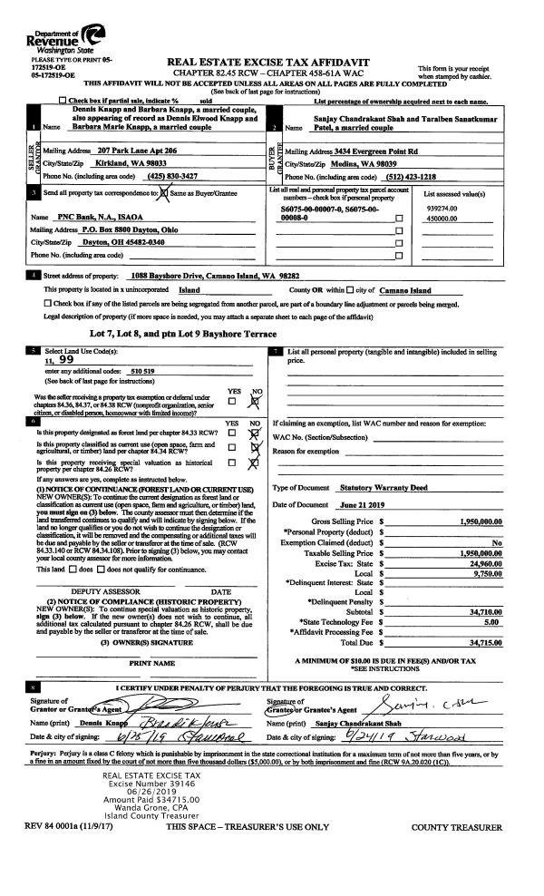 | 1 | 06/21/2019 | WD | Warranty Deed | KNAPP, DENNIS | SHAH, SANJAY CHANDRAKANT | | | $1,950,000.00 | 39146 | 4466127 |