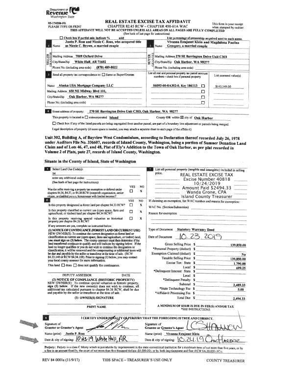 | 2 | 10/23/2019 | WD | Warranty Deed | ROSS, JUSTIN P | KLEIN, VIVANNA ESTAJANET | | | $139,850.00 | 40818 | 4474007 |