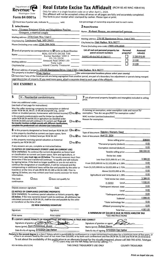 | Mailing Address: | 270 SE BARRINGTON DR, UNIT6 C303 OAK HARBOR, WA 98277 | % Ownership: | 100.0000000000% |