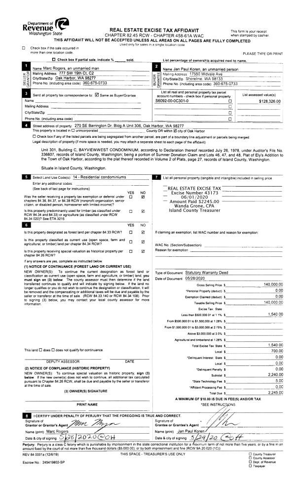 | 2 | 05/28/2020 | WD | Warranty Deed | ROGERS, MARC | KOREN, JAN PAUL | | | $140,000.00 | 43173 | 4487754 |