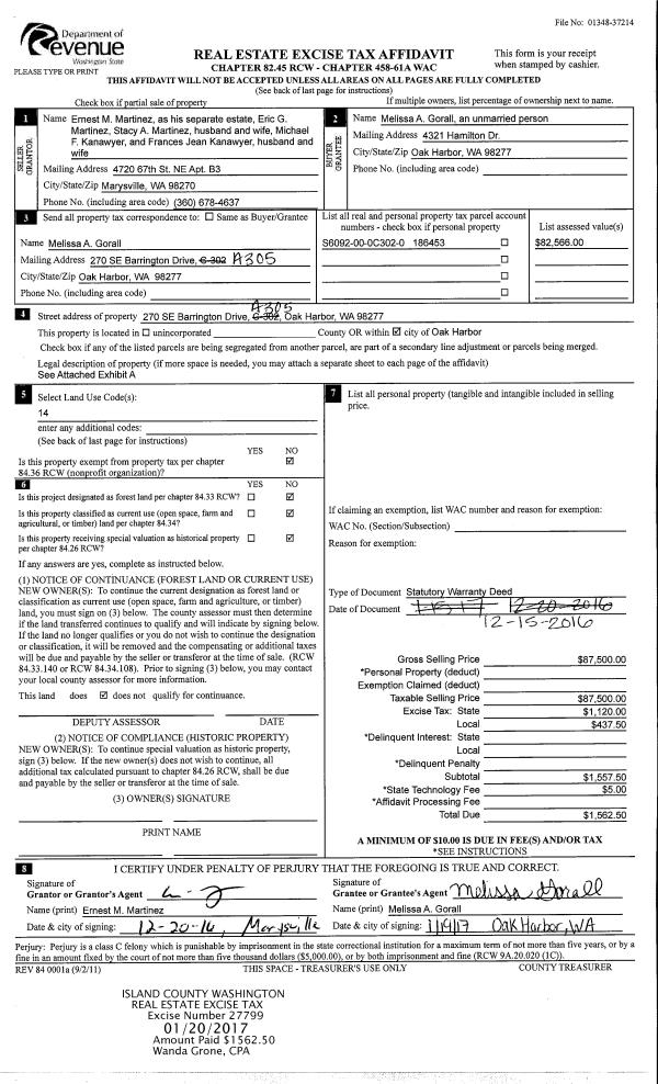 | Mailing Address: | 270 SE BARRINGTON DR UNIT A305 OAK HARBOR, WA 98277 | % Ownership: | 100.0000000000% |