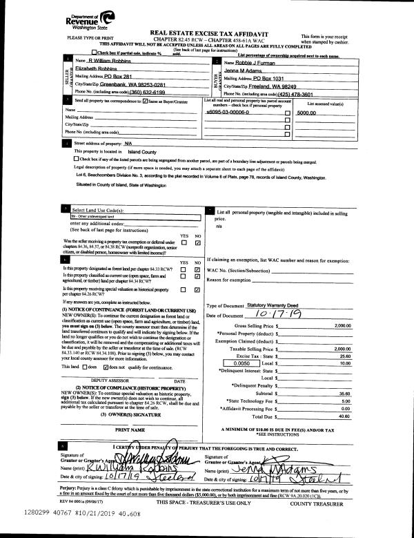 | 1 | 10/17/2019 | WD | Warranty Deed | ROBBINS, R WILLIAM | FURMAN, ROBBIE J | | | $2,000.00 | 40767 | 4473758 |