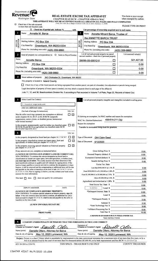 | 1 | 05/12/2020 | QCD | Quit Claim Deed | BARCA, ANNETTE M | BARCA TTEE, ANNETTE MINARD | | | $0.00 | 43267 | 4488336 |