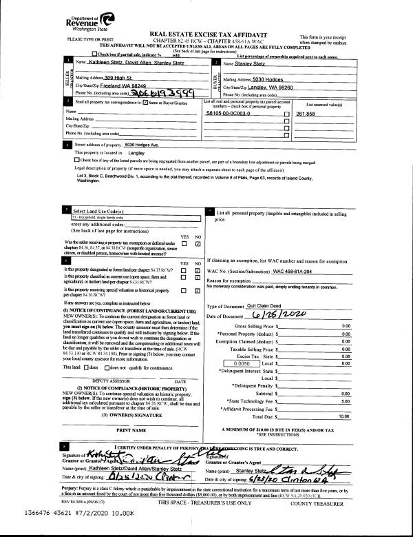 | 2 | 06/25/2020 | QCD | Quit Claim Deed | STETZ, KATHLEEN M | STETZ, STANLEY J | | | $0.00 | 43621 | 4490349 |