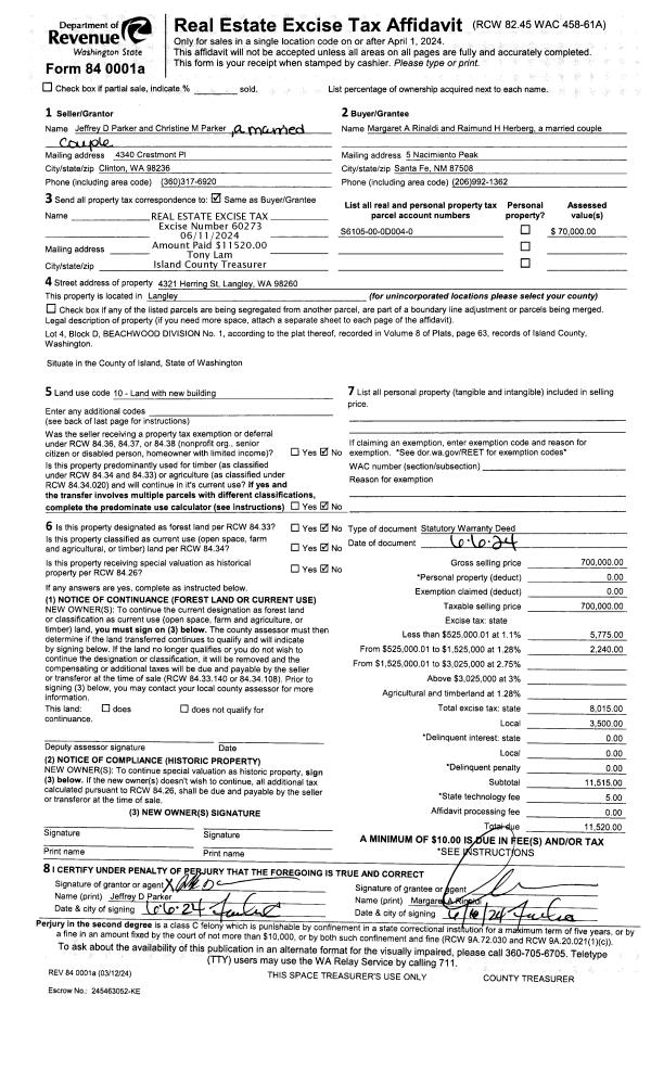 | 1 | 06/06/2024 | WD | Warranty Deed | PARKER, JEFFREY D | RINALDI, MARGARET A | | | $700,000.00 | 60273 | 4573298 |