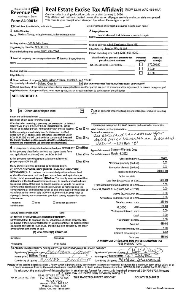 | Tax Area: | 719 - APPRAISER-S Whid Schl Dist, outside Langley, vacant & 50 acres or less | Land Use Code | 99 |