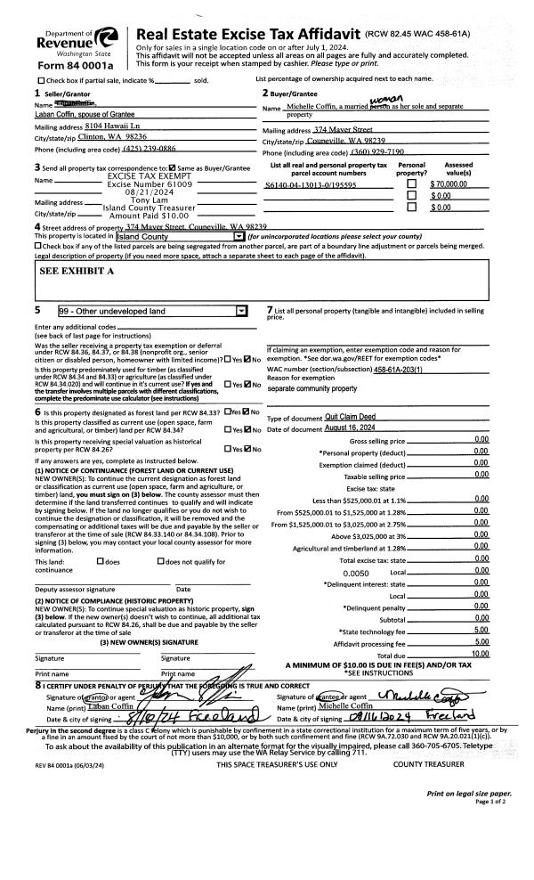 | 1 | 08/16/2024 | QCD | Quit Claim Deed | COFFIN, LABAN | COFFIN, MICHELLE | | | $0.00 | 61009 | 4576035 |