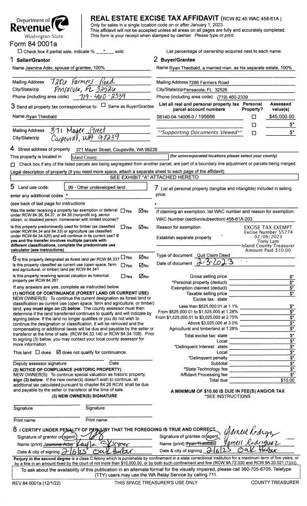| 1 | 02/03/2023 | QCD | Quit Claim Deed | ADER, JASMINE | THEOBALD, RYAN | | | $0.00 | 55774 | 4556434 |