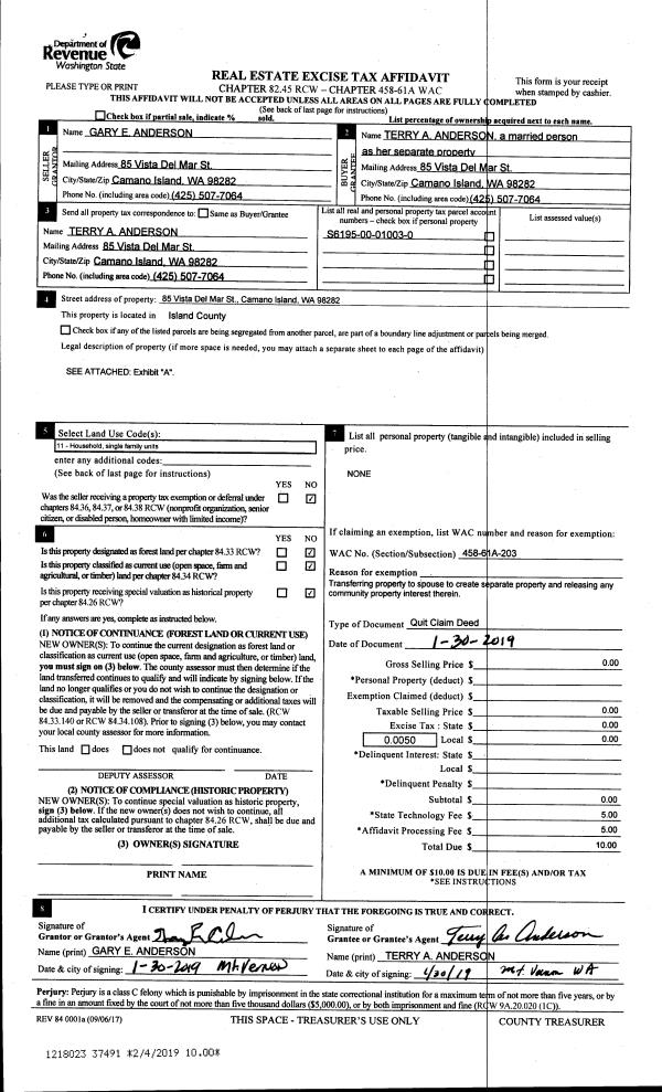 | 5 | 01/30/2019 | QCD | Quit Claim Deed | ANDERSON, GARY E | ANDERSON, TERRY A | | | $0.00 | 37491 | 4458710 |