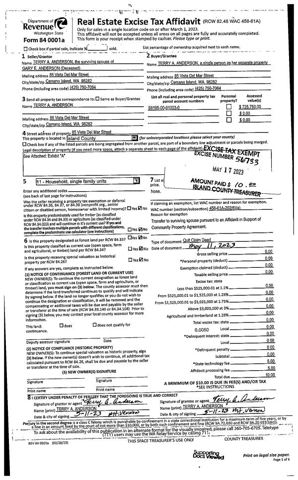 | 1 | 05/11/2023 | QCD | Quit Claim Deed | ANDERSON, TERRY A | ANDERSON, TERRY A | | | $0.00 | 56733 | 4560034 |