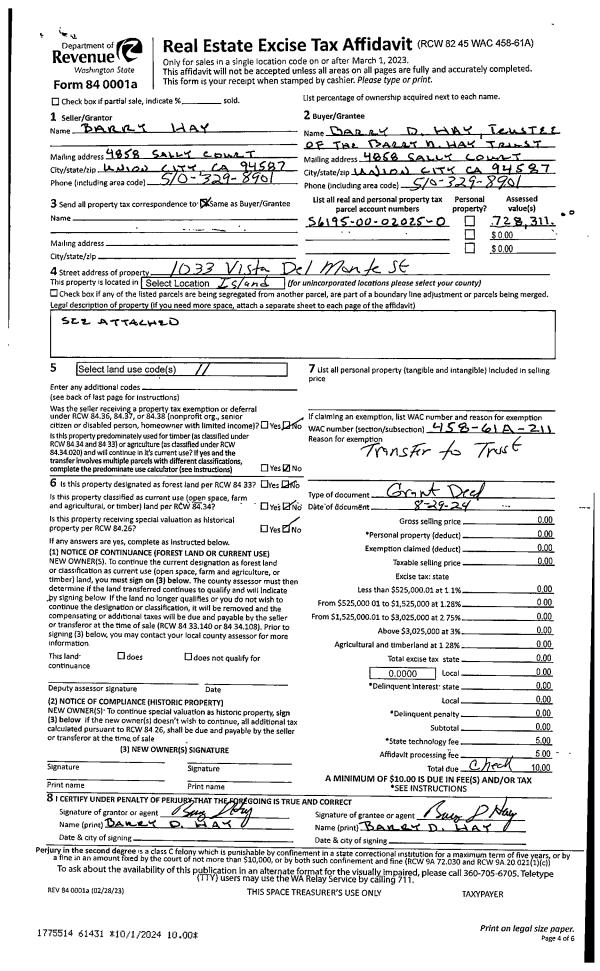 | 1 | 08/29/2024 | GRANTD | Grant Deed | HAY, BARRY D | HAY TTEE, BARRY D | | | $0.00 | 61431 | 4577703 |
