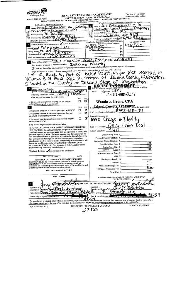 | 3 | 01/03/2017 | CHGOFIDENT | DNU - Change In Identity | JADERHOLM, JERRY E | JAD ENTERPRISES, LLC | | | $0.00 | 27586 | 4414478 |
