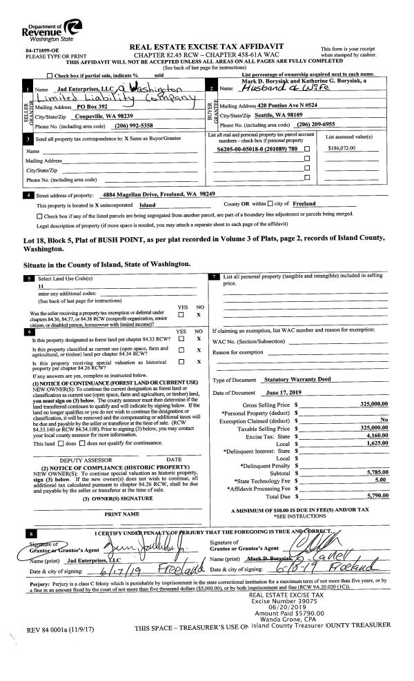 | 2 | 06/17/2019 | WD | Warranty Deed | JAD ENTERPRISES, LLC | BORYSIAK, MARK D | | | $325,000.00 | 39075 | 4465805 |