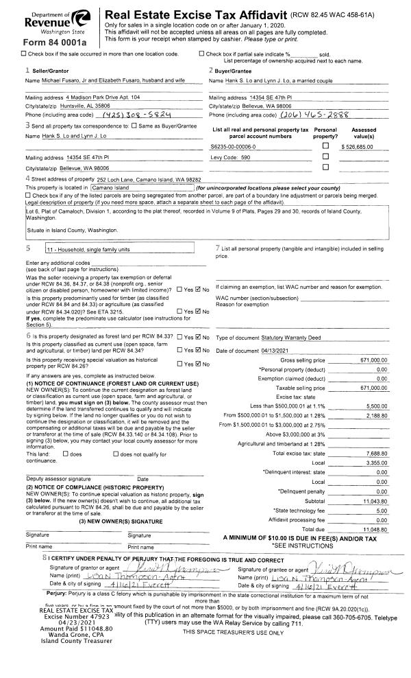 | 1 | 04/23/2021 | WD | Warranty Deed | FUSARO JR, MICHAEL | LO, HANK S | | | $671,000.00 | 47923 | 4517295 |
