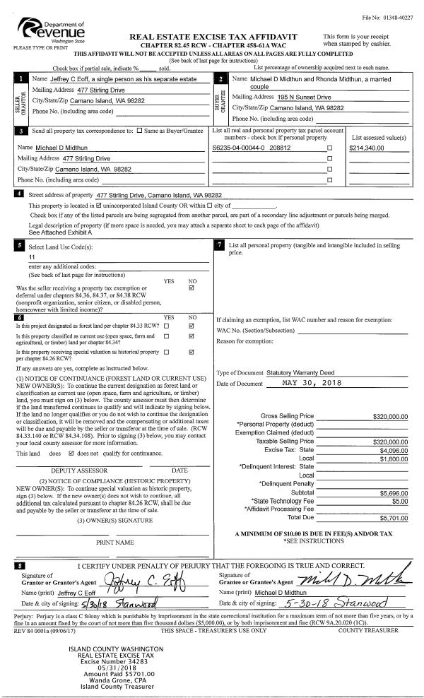 | 3 | 05/30/2018 | WD | Warranty Deed | EOFF, JEFFREY C | MIDTHUN, MICHAEL D | | | $320,000.00 | 34283 | 4445206 |