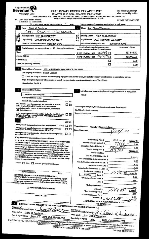 | 2 | 05/20/2021 | WD | Warranty Deed | SANTERRE, TAMI M | WAISANEN, LORI DIANE | | | $103,000.00 | 48452 | 4520487 |