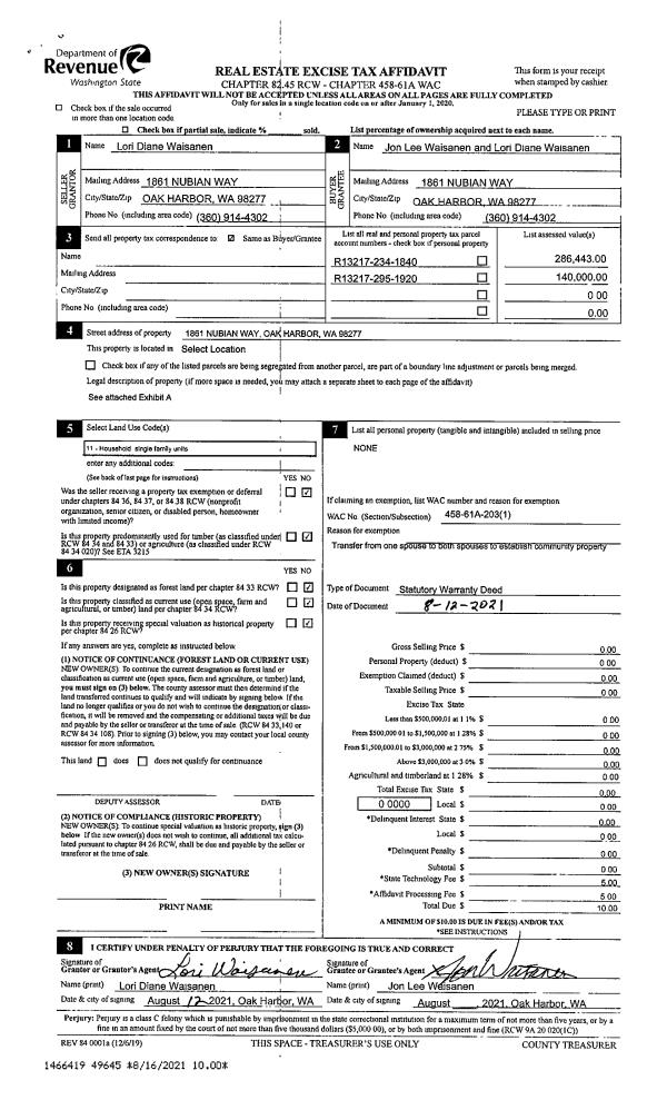 | 1 | 08/12/2021 | WD | Warranty Deed | WAISANEN, LORI DIANE | WAISENEN, JON LEE | | | $0.00 | 49645 | 4526920 |