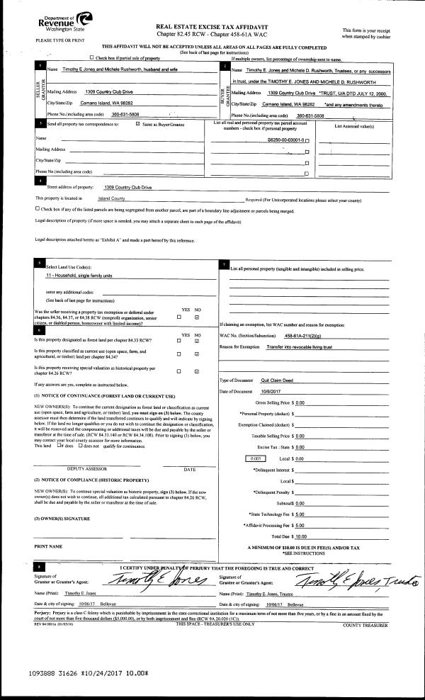 | 1 | 10/06/2017 | QCD | Quit Claim Deed | JONES, TIMOTHY E | JONES TRUSTEE, TIMOTHY E | | | $0.00 | 31626 | 4432687 |