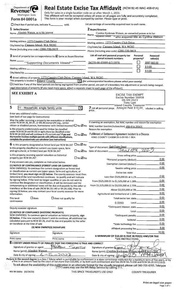 | 1 | 06/05/2023 | QCD | Quit Claim Deed | WATSON, ALASDAIR | RYCKMAN-WATSON, CYNTHIA | | | $0.00 | 56958 | 4560826 |