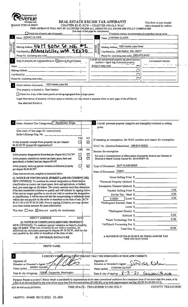 | 3 | 07/29/2021 | QCD | Quit Claim Deed | OLIVER, GERRY | OLIVER, CYNTHIA | | | $0.00 | 49488 | 2526081 |