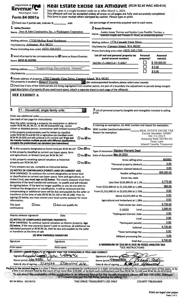 | Mailing Address: | KEISHIA LYNN PARDILLO TREVINO TAMARA D ROSS 1776 CASCADE VIEW DR CAMANO ISLAND, WA 98282 | % Ownership: | 100.0000000000% |