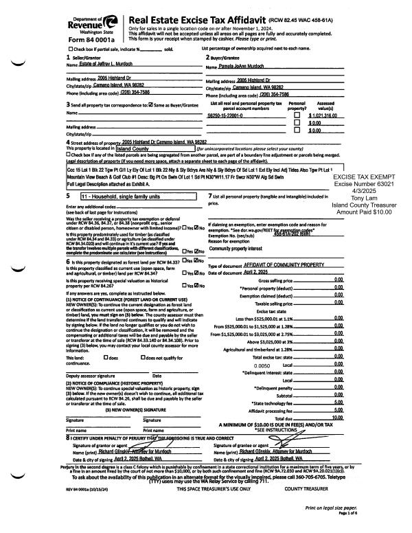 | 2 | 04/02/2025 | QCD | Quit Claim Deed | ESTATE OF JEFFREY L MURDOCH | MURDOCH, PAMELA JOANN | | | $10.00 | 63021 | 4584387 |