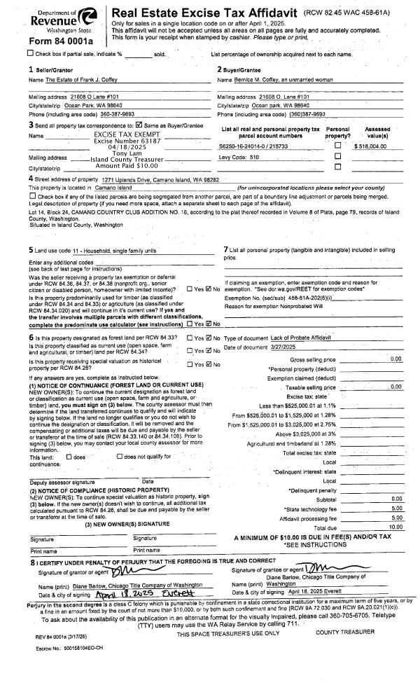 | 2 | 03/27/2025 | LACPROBATE | Lack of Probate | COFFEY, FRANK J | COFFEY, BERNICE M | | | $0.00 | 63187 | 4584701 |