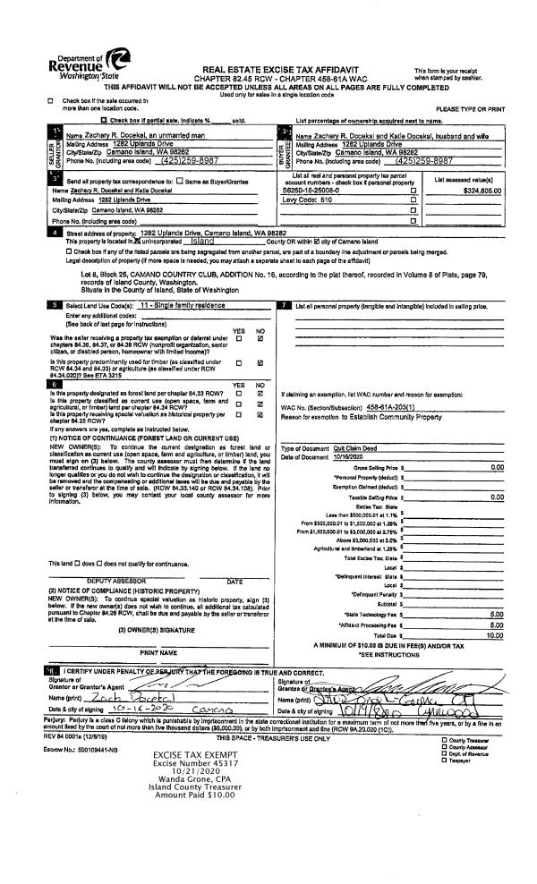 | Mailing Address: | KATIE DOCEKAL 1282 UPLANDS DR CAMANO ISLAND, WA 98282 | % Ownership: | 100.0000000000% |