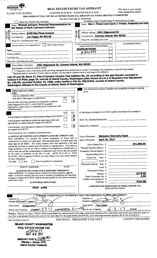 | 2 | 04/24/2017 | WD | Warranty Deed | JOHNSON, MARK LAWRENCE | FINSEN, DAN J | | | $291,000.00 | 29160 | 4421902 |