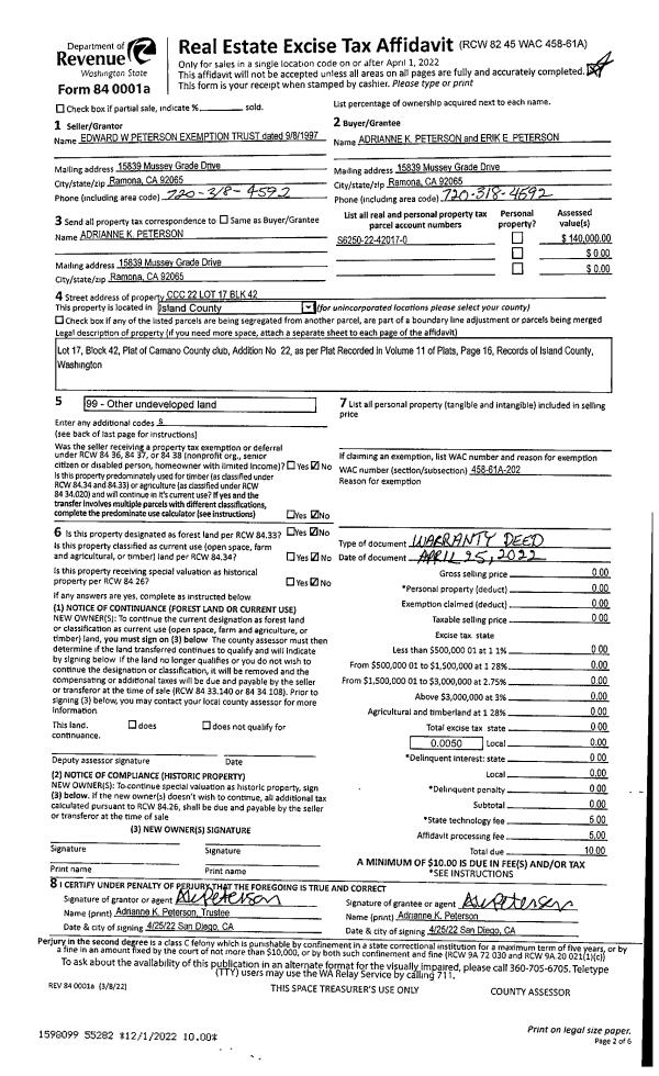 | 1 | 04/25/2022 | WD | Warranty Deed | PETERSON TRUSTEE, DARLENE J | PETERSON, ADRIANNE | | | $0.00 | 55282 | 4554387 |