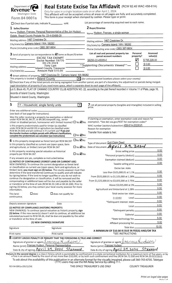 | 1 | 04/29/2024 | QCD | Quit Claim Deed | HUDSON, JON C & FRANCES M | HUDSON, FRANCES | | | $0.00 | 59770 | 4571724 |