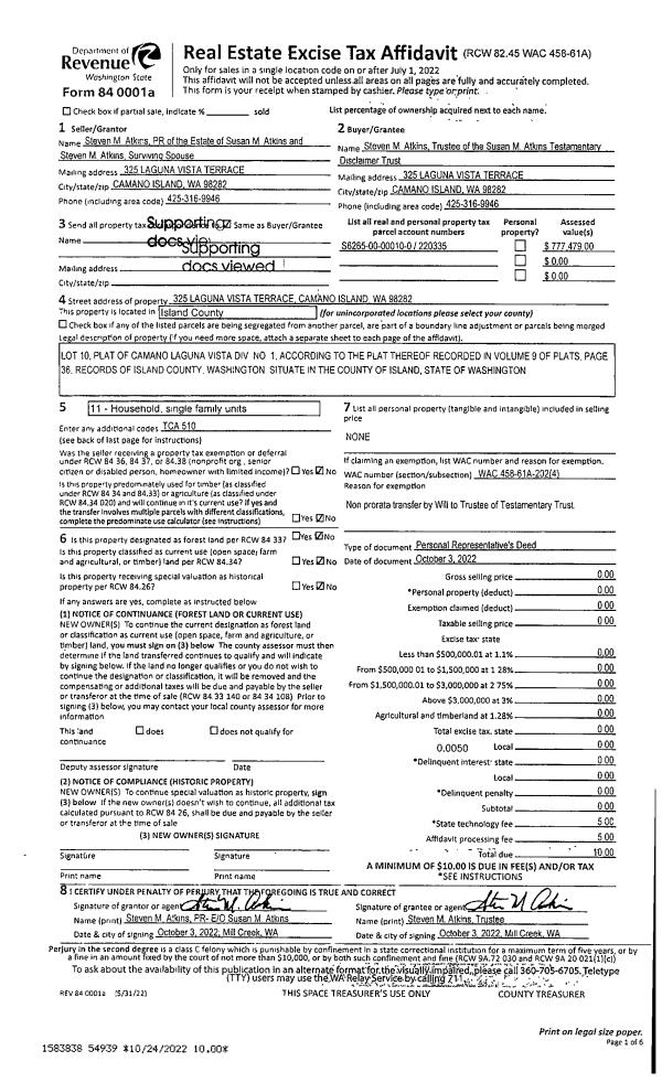| 1 | 10/03/2022 | PRD | Personal Representatives Deed | ATKINS, STEVEN M | ATKINS TTEE, STEVEN M | | | $0.00 | 54939 | 4552902 |