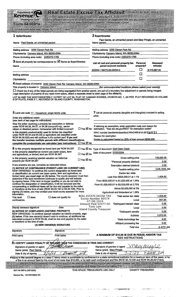 | 1 | 07/02/2024 | QCD | Quit Claim Deed | GARCIA, PAUL | GARCIA, PAUL | | | $129,500.00 | 60574 | 4574341 |