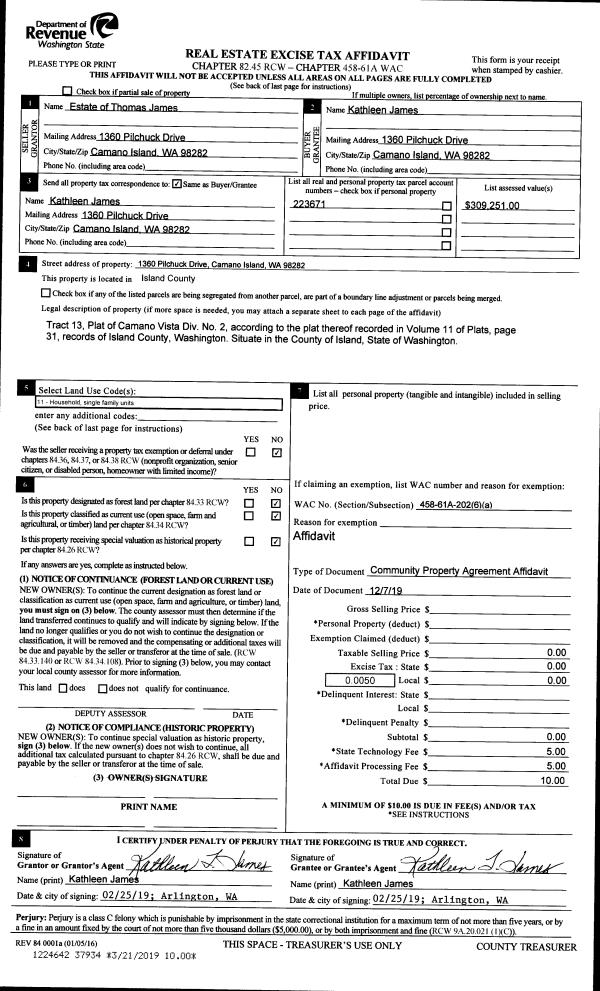 | 2 | 04/11/2019 | CCOMPROP | Create Community Property | JAMES, THOMAS J | JAMES, KATHLEEN T | | | $0.00 | 37934 | 4460813 |