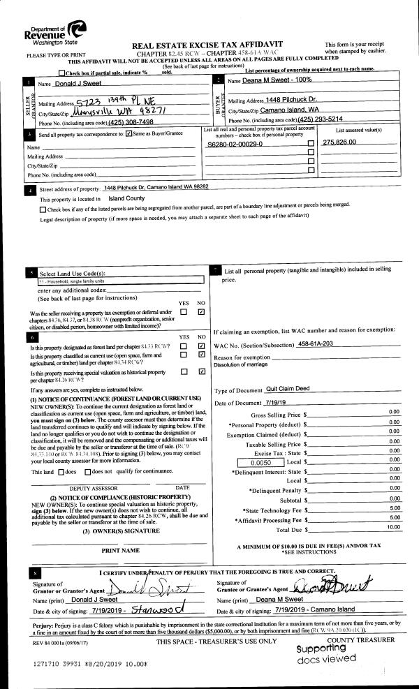 | 1 | 07/19/2019 | QCD | Quit Claim Deed | SWEET, DONALD J | SWEET, DEANA M | | | $0.00 | 39931 | 4469720 |