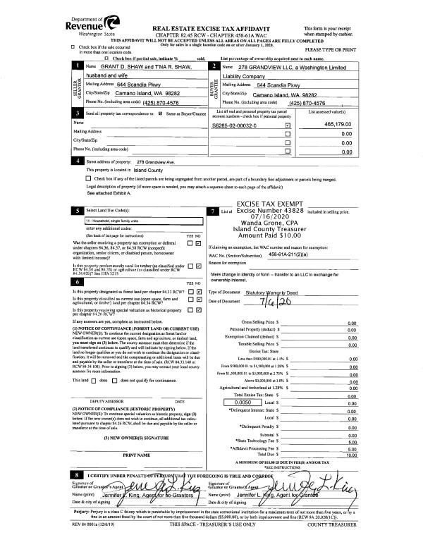 | 1 | 07/06/2020 | WD | Warranty Deed | SHAW, GRANT D | 278 GRANDVIEW, LLC | | | $0.00 | 43828 | 4491398 |