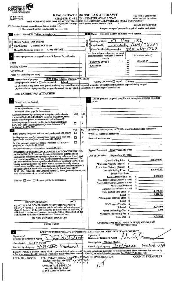| 1 | 09/10/2020 | WD | Warranty Deed | TALBOT, DAVID W | BAGBY, MICHAEL | | | $378,000.00 | 44739 | 4496550 |