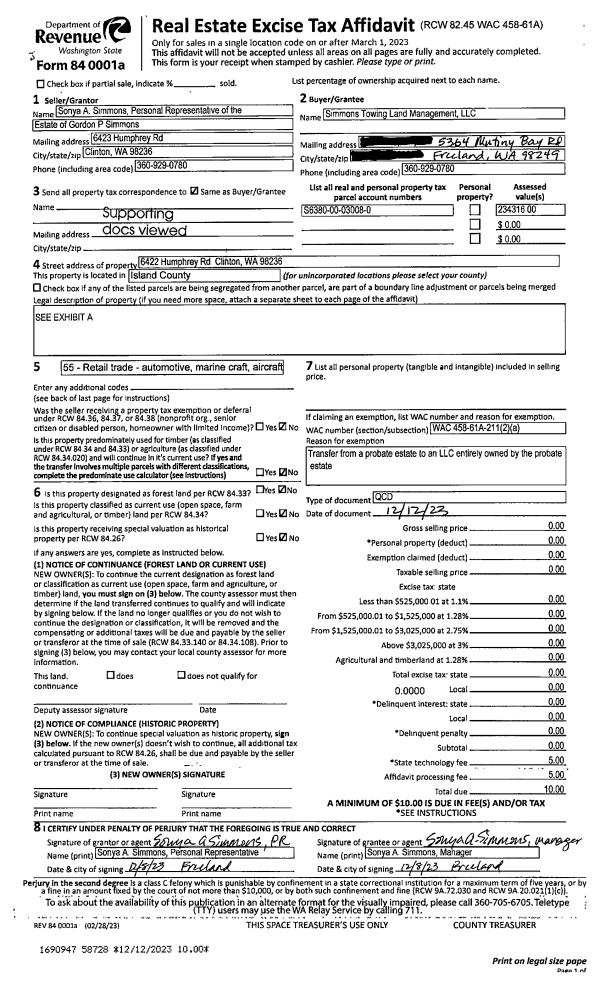 | 2 | 12/12/2023 | QCD | Quit Claim Deed | SIMMONS, GORDON | SIMMONS TOWING LAND MANAGEMENT LLC | | | $0.00 | 58728 | 4567527 |