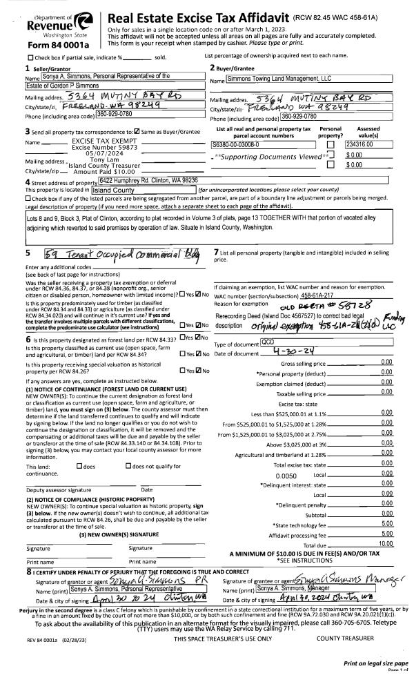 | 1 | 04/30/2024 | QCD | Quit Claim Deed | SIMMONS, GORDON | SIMMONS TOWING LAND MANAGEMENT LLC | | | $0.00 | 59873 | 4572028 |