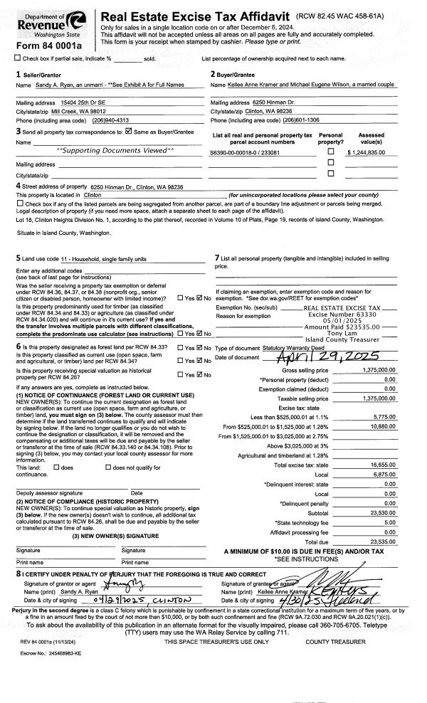 | 1 | 04/29/2025 | WD | Warranty Deed | RYAN, SANDY A | KRAMER, KEILEE ANNE | | | $1,375,000.00 | 63330 | 4585223 |