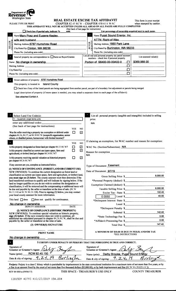 | 1 | 09/07/2019 | EZ | Easement | POSZ, MARY A | PUGET SOUND ENERGY | | | $8,000.00 | 40793 | 4473905 |