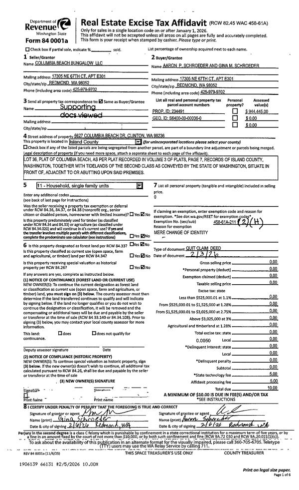| 1 | 02/03/2026 | QCD | Quit Claim Deed | COLUMBIA BEACH BUNGALOW LLC | SCHROEDER, AARON P | | | $0.00 | 66131 | 4596544 |